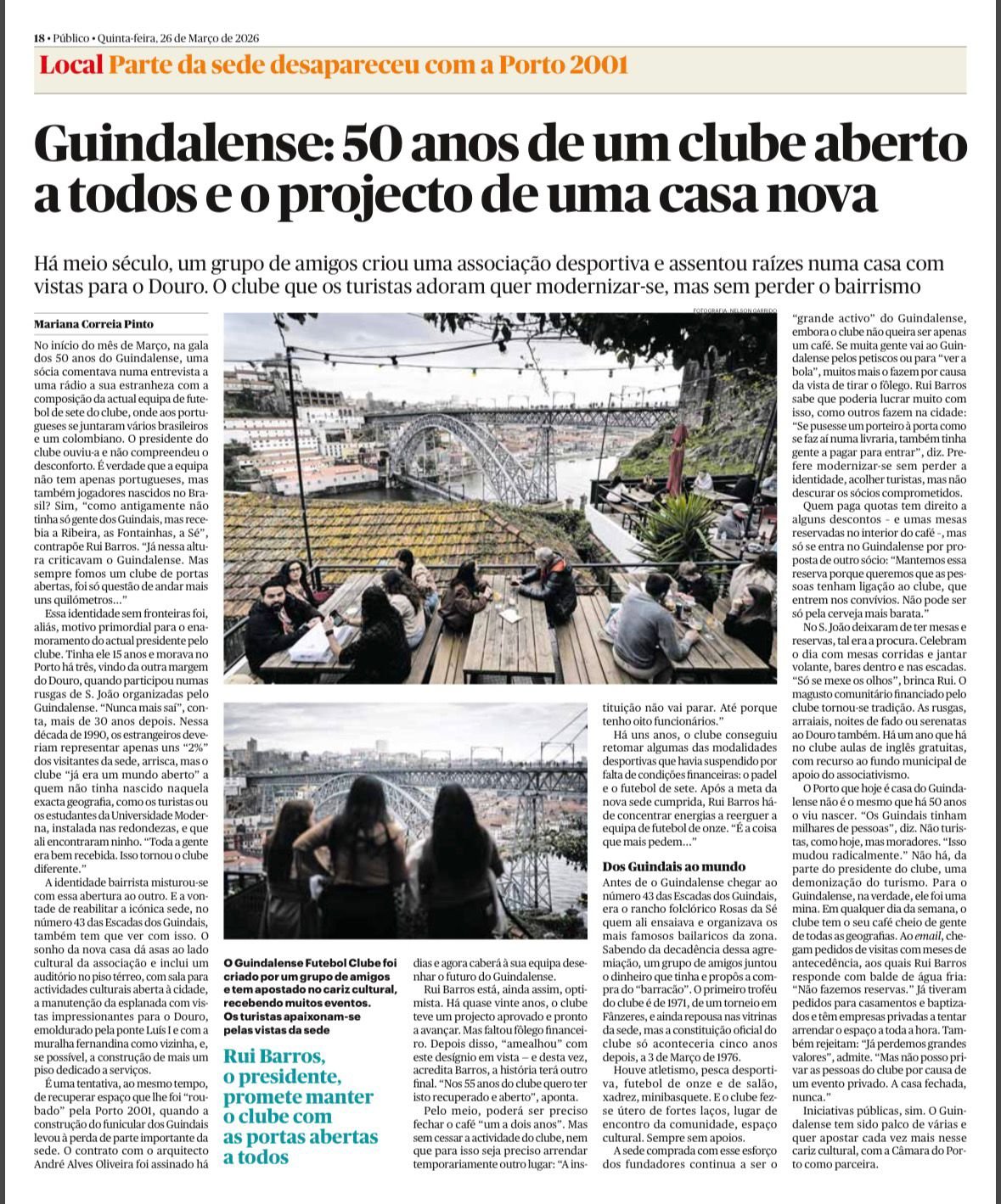 No dia 26 de março de 2026, foi publicada uma matéria no jornal Público que destaca os 50 anos de história do Guindalense Futebol Clube e o seu papel enquanto instituição aberta à comunidade.